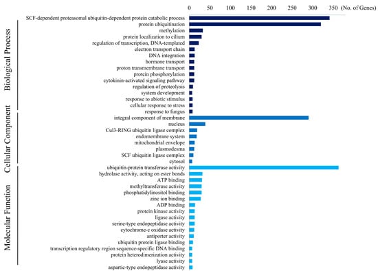 GO annotations were assigned using the Blast2GO bioinformatics platform to predict the functions of the wheat F-box genes in cellular metabolism. In total, 510 and 531 of the 1796 F-box genes were identified by mapping and annotation, respectively. The top three GO terms among the 1032 of the 1796 F-box genes were biological process, molecular functions, and cellular components (Table S3). The results of the Fisher’s exact test (false discovery rate < 0.05, p < 0.05) showed the enrichment of several distinguishable GO terms in each of the three categories (Figure 2 and Table S4). In total, 341 and 320 F-box genes were predicted under the terms SCF-dependent proteasomal ubiquitin-dependent protein catabolic process (GO:0031146) and protein ubiquitination (GO:0016567) of the biological process category, respectively, whereas 290 F-box genes were assigned to the integral component of the membrane (GO:0016021) in the cellular component category of the GO terms, followed by the nucleus (GO:0005634) and Cul3-RING ubiquitin ligase complex (GO:0031463). In the molecular function category, 363 F-box genes were predicted to be involved in ubiquitin–protein transferase activity (GO:0004842).