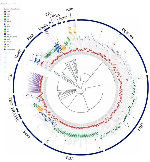Phylogenic analysis of wheat F-box genes. A phylogenetic tree was generated using the Interactive Tree of Life (iTOL) tool with the amino acid sequences of F-box proteins that contained FBX domains in the N-terminal and one or more known functional domains in the C-terminal of the peptide sequences.