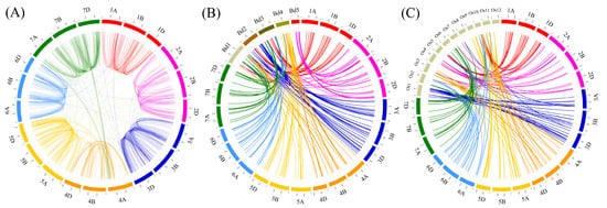 Synteny analysis of wheat F-box genes. (A) Synteny between F-box genes on the wheat homoeologous chromosome. F-box genes matched with the BLASTP algorithm with an E-value of <1 × 10−10, minimum sequence identity of >90%, and bitscore of >500 were used to create a synteny map of wheat F-box genes. Synteny between wheat (B) and Brachypodium distachyon and (C) rice. For synteny analysis of wheat against Brachypodium and rice, BLASTP was conducted with an E-value threshold of 1 × 10−10 and sequence identity of >80%. Colored lines denote syntenic regions between chickpea chromosomes and others. The genomes size of Brachypodium and rice were enlarged by a factor of 10.