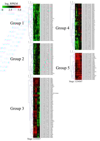 A transcriptome analysis of wheat at various developmental stages was conducted to investigate the expression profiles of putative F-box genes. Transcript abundance was analyzed based on RPKM values, which revealed that some F-box genes were differentially expressed in one or more of the developmental stages of wheat. The expression patterns of F-box genes in groups 2, 3, and 4 (Figure 6) were specific to particular developmental stages. The expression patterns of TraesCS3A01G377800.1, TraesCS5A01G534800.1, and TraesCS7A01G559600.1 in group 2; TraesCS1D01G268400.1, TraesCS4A01G275700.1, and TraesCS6B01G275600.1 in group 3; TraesCS1B01G407200.1, TraesCS3D01G379700.1, and TraesCS6D01G130000.1 in group 4 were validated by qRT-PCR, and the results corroborated the RNA-Seq results, which confirmed developmental stage-specific expression in vegetative stages. Because the cellular and biological statuses greatly change during seed maturation and the grain filling stage, post-translational regulation is necessary to promptly activate phage conversion for seed development. In the present study, 49 F-box genes, including TraesCS1B01G407200.1, TraesCS3D01G379700.1, and TraesCS6D01G130000.1 in group 4, were found to be differentially expressed in at least one grain developmental stage in wheat, suggesting that these F-box genes are involved in protein regulation during seed maturation. By contrast, 60 F-box genes in group 3, including TraesCS1D01G268400.1, TraesCS4A01G275700.1, and TraesCS6B01G275600.1, were highly expressed in the vegetative stages rather than the seed development stages. Some F-box genes in group 3 with tissue-specific expressions participate in important functions in target tissues during plant growth in vegetative stages, similar to the corresponding F-box genes in rice and Arabidopsis [,]. Conversely, the continuously expressed F-box genes in groups 1 and 5 might be involved in general cellular processes, such as the regulation of protein homeostasis during plant development.