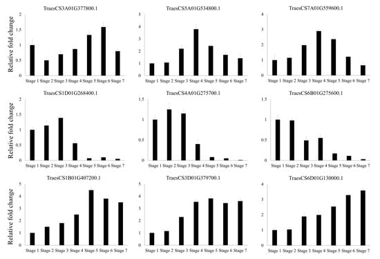 Validation of RNA-Seq results by qRT-PCR in wheat at different developmental stages. Stage 1 (leaf; three leaves emerged, Z13), Stage 2 (leaf; main stem and four tillers present, Z24), Stage 3 (leaf; tip of ear just visible, booting stage, Z51), Stage 4 (spikelet; beginning of anthesis stage, Z61), Stage 5 (spikelet; early milk development stage, Z73), Stage 6 (spikelet; early dough stage, Z83), and Stage 7 (spikelet; hard grain stage, Z91) are shown. Z, Zadoks growth scale. All samples were normalized to the actin gene. The data are presented as the average ± standard error (n = 3).