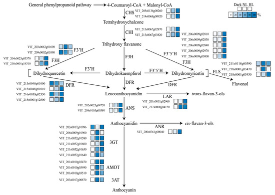 3.2. Effect of Light Intensity on Flavonoid Pathway Gene Expression