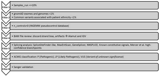 - Richards, S.; Aziz, N.; Bale, S.; Bick, D.; Das, S.; Gastier-Foster, J.; Grody, W.W.; Hegde, M.; Lyon, E.; Spector, E.; et al. Standards and guidelines for the interpretation of sequence variants: A joint consensus recommendation of the American college of medical genetics and genomics and the association for molecular pathology. Genet. Med. Off. J. Am. Coll. Med. Genet. 2015, 17, 405–424. [Google Scholar] [CrossRef]