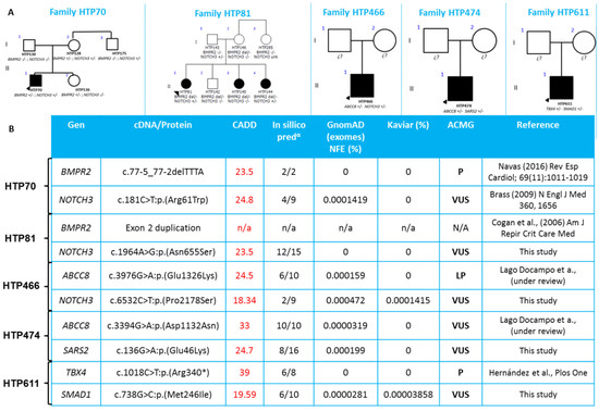 - Navas, P.; Tenorio, J.; Quezada, C.A.; Barrios, E.; Gordo, G.; Arias, P.; Lopez Meseguer, M.; Santos-Lozano, A.; Palomino Doza, J.; Lapunzina, P.; et al. Molecular analysis of BMPR2, TBX4, and KCNK3 and genotype-phenotype correlations in Spanish patients and families with idiopathic and hereditary pulmonary arterial hypertension. Rev. Esp. Cardiol. 2016, 69, 1011–1019. [Google Scholar] [CrossRef]