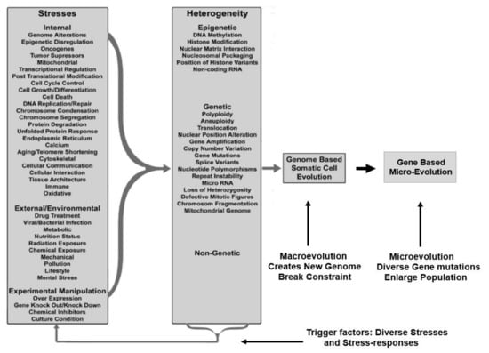 The understanding of evolution depends on analyses of “variable genotype and phenotype with differential fitness” and “evolving and constrained patterns of selection under different environmental pressures” [20,24,25,26]. Accordingly, the somatic evolutionary mechanism can be explained by four components. (1) stress, both initial internal and external; (2) genomic/epigenetic dynamics and cellular adaptation; (3) genome-based macro-evolution followed by gene/epigenetic-based microevolution; and (4) breaking the homeostasis of multi-level system constraints, e.g., normal cell regulation, cell populations, tissues, and organs. The four components work in the following order: cellular adaptation requires genetic and epigenetic changes and, as a trade-off, it leads to genome alterations. When the new genome becomes dominant, it can break the system constraints of the higher level. Even though only four key components are involved, stress and the stress response include many causative factors, including genomic and environmental factors, that are too numerous to be handled. Recently, a new cancer evolutionary model was proposed to reconcile the contribution from genome-mediated macro-evolution and gene-mediated micro-evolution: all individual molecular mechanisms can be classified as genomic/environmental interactions, which lead to macro-cellular evolution (the emergence of a new genome), followed by micro-cellular evolution to grow the cancer cell population and break the system constraints (tissues, organs) [3,27].