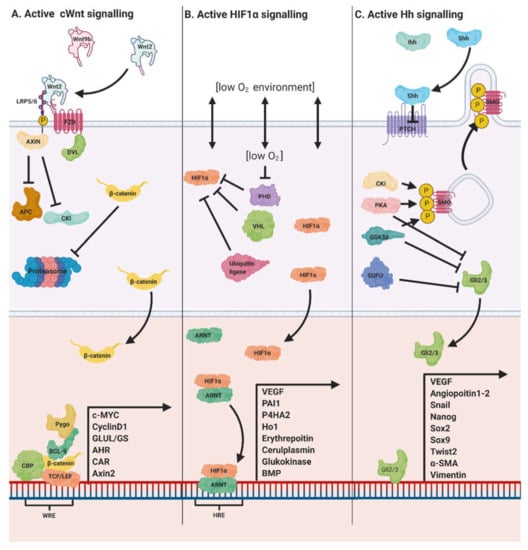 All intracellular pathways are inextricably linked with the activity of other pathways. This interdependence allows for the formation of the dynamic physical infrastructure which enables cells to communicate with each other and with their environment. Within the context of Wnt/β-catenin signalling in the liver, two pathways are of particular interest: (i) the Hh pathway and (ii) the HIF pathway [117]. In this section, we briefly highlight insights into how interactions with these pathways help regulate liver homeostasis [118,119].