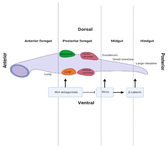 Following gastrulation, the DE forms into the primitive gut tube along the anterior–posterior axis from which the foregut, midgut and hindgut domains emerge (Figure 3). Regulation of Nodal by Wnt/β-catenin signalling is important in initial endoderm patterning. In Xenopus and zebrafish, activation of Wnt/β-catenin signalling on the future dorsal side of the blastula regulates Nodal signalling levels to induce expression of the haematopoietically expressed homeobox (HHEX) gene which is required for foregut development in the anterior endoderm [48,49]. Expression of downstream transcription factors including HHEX and FOXA2 is induced, and they are predominantly expressed in the anterior aspect of the embryo. These transcription factors promote foregut endoderm fate and future liver development [38,46]. Signals from adjacent mesoderm tissue, including Wnts, fibroblast growth factor (FGF) 4 and bone morphogenic protein (BMP), repress foregut development by blocking the expression of HHEX and FOXA2 [16,50]. Therefore, foregut formation only occurs when FGF4 and Wnt/β-catenin signalling is supressed in the anterior endoderm [16,50]. Here, secreted FZD-related protein 5 (SFRP5), a secreted Wnt inhibitor, is necessary to maintain the foregut progenitors, and subsequent liver development [51]. Thus, SFRP5 may be involved in determining fate specification of cells destined to form organs of the gastro-intestinal (GI) tract by modulating Wnt/β-catenin signals [52]. Consistent with this concept, McLin et al. found that the foregut did not develop in the anterior endoderm when Wnt/β-catenin was activated [50]. However, inhibition of Wnt/β-catenin signalling, through the overexpression of the destruction complex member GSK3β, was sufficient to induce foregut fate, highlighting the importance of this pathway in endoderm patterning [50].