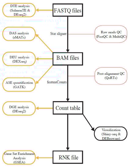 OneStopRNAseq employs the widely used FastQC [37] to check raw read quality, and MultiQC [38] to generate an integrated report. The workflow adopts STAR for read alignment [39]. Currently, RNA-seq data analyses based on human, mouse, yeast, fruit fly, zebrafish, and worm genomes are supported. However, other genomes can be easily added in response to users’ requests. Post-alignment RNA-seq quality control is performed using QoRTs [40] to output the most comprehensive visualization of quality metrics of RNA-seq data. The workflow uses featureCounts [41] to obtain a gene-level count table from BAM files, rMATS [42] for detecting DAS, DEXseq [43] for DEU analysis, SalmonTE [44] for TE expression quantification, DESeq2 [45] for DGE and DTE analysis, ASEReadCounter of GATK [46] for allele-specific expression quantification (ASE), and GSEA [47] for gene-set-enrichment analysis.