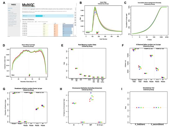 First, the sequencing quality of the raw reads of individual FASTQ files was checked using FastQC [37]. The final all-in-one quality-control report was generated using MultiQC [38]. Representative plots showing multiple quality metrics of raw sequencing data are shown in Supplementary Figure S1 and Figure 2A. To perform RNA-seq data-specific quality control, BAM files produced by STAR [39] were analyzed using QoRTs [40]. Examples of relevant plots showing RNA-seq data quality are shown in Figure 2B–I. Both FastQC and QoRTs analyses demonstrated that the RNA-seq data were of high quality.