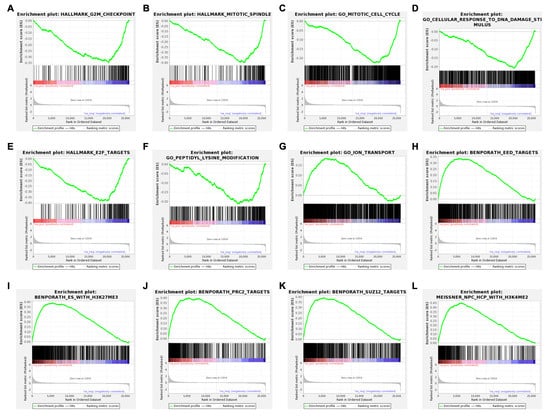 A gene-level read-count table was generated using featureCounts [41]. Principal component analysis (PCA) and Poisson distance plots (Figure 3A,B) demonstrated that gene expression profiles of USP7797-treated samples were clearly different from those of CK samples. Differentially expressed genes were identified using DESeq2 by testing three contrasts: CK_24h—USP7797_24h, CK_48h—USP7797_48h, and (USP7797_48h—USP7797_24 h) – (CK_48h—CK_24h). The volcano plot (Figure 3C) and heatmap (Figure 3D) display the differentially expressed genes between CK samples and those treated with USP7797 at 48 h post treatment. MSigDB-based gene-set enrichment analysis (GSEA) verified the results reported by the original publication [48]. For example, USP7797 treatment downregulated the expression of many genes involved in the cell cycle (G2M checkpoint, mitotic spindle, mitotic cell cycle; Figure 4A–C). USP7797 treatment also upregulated the expression of genes that are normally silenced by polycomb repressive complex 2 (PRC2) (Figure 4H–L [54]). Additionally, USP7797 treatment downregulated the expression of genes responsive to DNA damage stimulus (Figure 4D), and those facilitating histone acetylation and ubiquitination (Figure 4F and Supplementary Table S3. The expression of many E2F targets was downregulated, and many genes involved in ion transportation were upregulated by USP7797 (Figure 4F,G). Gene ontology–biological process terms (protein monoubiquitination, protein polyubiquitination and histone deubiquitination) and associated gene sets were enriched among downregulated genes in response to USP7797 treatment (Supplementary Table S3). These gene-set-enrichment analysis results are consistent with the role of USP7797 as a small-molecule inhibitor of the ubiquitin-specific peptidase (USP7) that cleaves ubiquitin from its substrates [48,55].