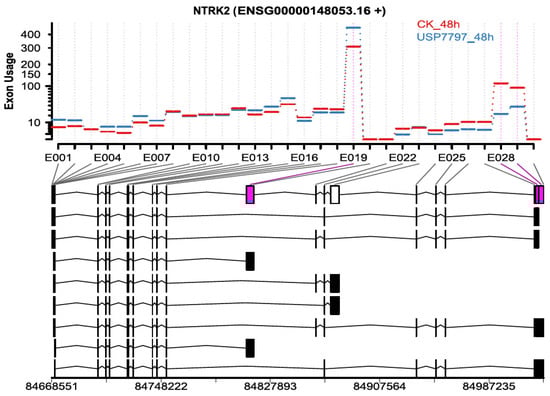 In addition to differential gene-expression analysis, as performed by Ohol et al. [48], we performed differential exon-usage and alternative-splicing analyses using the OneStopRNAseq application. We identified 819 and 4666 exons of differential usage (|log2(fold change)| ≥ log2(1.5) and FDR < 0.05) for contrasts USP7797_24h—CK_24h and USP7797_48h—CK_48h, respectively. Only two exons showed significant time-by-treatment interaction effect on differential exon usage (FDR < 0.05). Figure 5 shows one of the top differentially used exons between the sample treated with USP7797 and the CK at 48 h post treatment. We also identified a small number of differential alternative splicing events (see Supplementary Table S4); thus, OneStopRNAseq facilitates the simultaneous identification of alternative-splicing events, differentially used exons, and differentially expressed genes, which can be used to generate potential hypothesis for further investigation.