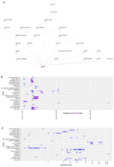 The structure of the OneStopRNAseq workflow and runtime statistics of each job. (A) A directional acyclic graph (DAG) showing the structure of the workflow. Jobs at lower levels depend on connected jobs at higher level and the workflow is executed from the top to the bottom following the specified job dependencies. (B) Creation and finish dates of each job. Blue circles indicate job creation dates and purple crosses show job finish dates. (C) Runtime of each job in minutes.