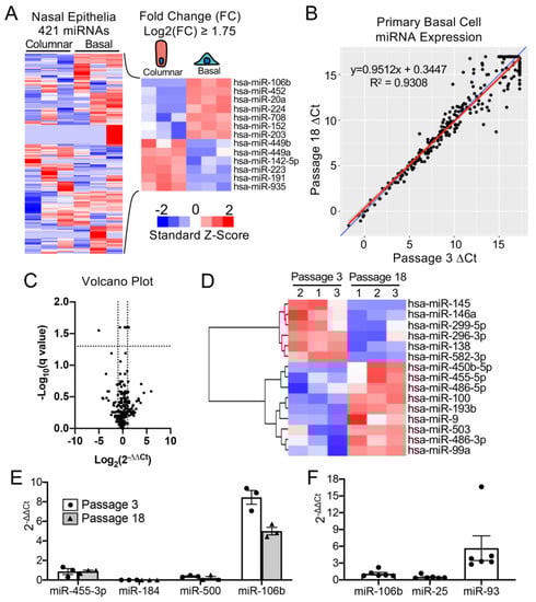 mMiR-106b is stably expressed at high levels in proliferating human basal cells. (A) Published data of miRNAs detected by high throughput sequence profiling of nasal basal cells and columnar cells (Accession: GSE22145) were used to generate a heatmap of 421 expressed miRNAs (left) and 13 miRNAs with a Log2 fold difference greater than 1.75 or less than −1.75 (right). (B) Correlation of miRNA expression in basal cells at Passage 3 and Passage 18 detected by qPCR array with the blue line represents a theoretical perfect correlation (x = y), and the red line represents linear regression model. (C) Volcano plot of miRNA array data indicating genes that were differentially expressed between passages 3 and 18. (D) Heatmap of miRNA array data with unsupervised hierarchical clustering of 15 miRNAs (of 252 detected) with an absolute fold change ≥ 2 and an unadjusted p value of ≤0.05. (E) Relative quantification of candidate basal cell-specific miRNAs, miR-184, miR-500, and miR-106b compared to a known basal cell-specific miR-455-3p. Freshly isolated primary human tracheobronchial cells were passaged 3 (P3) and 18 (P18) times in SAGM-EA media (N = 3). (F) Relative quantification of miRNAs belonging to miR-106b-25 cluster in passage 3 basal cells (N = 6). Each dot represents one donor.