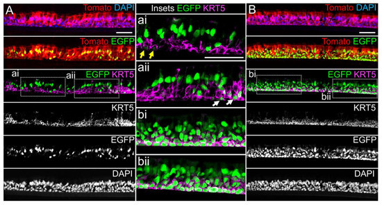 ALI membranes were fixed in 4% paraformaldehyde (PFA) overnight prior to washing with phosphate-buffered saline (PBS) and embedding in Tissue-Tek® O.C.T. Compound (OCT) frozen blocks. Frozen sections were cut at 10 μm and post-fixed in 4% PFA for 20 min, rinsed three times with PBS, and then incubated in blocking buffer containing 20% donkey serum, 0.5% triton X-100, 1 mM CaCl2 in PBS for 1 h. Samples were then blocked with 1% donkey serum and then incubated with primary antibody in diluent buffer containing 1% donkey serum, 0.5% triton X-100 and 1 mM CaCl2 in PBS overnight at 4 °C. Slides were then washed twice with PBS and then incubated with secondary antibody in diluent buffer at room temperature for 1 h. Nuclei were stained with Hoescht 33342 (10 μg/mL). The primary antibodies were chicken anti-GFP (1:1000, Aves Lab, #GFP-1020) and rabbit anti-keratin 5 (1:500, BioLegend, #PRB160P). The secondary antibodies used were Alexa Fluor 488 labeled donkey anti-chicken IgG (1:250, Jackson ImmunoResearch, #703-546-155, West Grove, PA, USA) and Alexa Fluor 647 labeled donkey anti-rabbit IgG (1:250, Jackson ImmunoResearch, #711-606-152, West Grove, PA, USA). Slides were washed three times with PBS and then mounted with Aquamount (Thermo Scientific, VWR #41799-008, Waltham, MA, USA). Images of stained slides were obtained using an LSM 880 confocal microscope (Zeiss, Oberkochen, Germany).