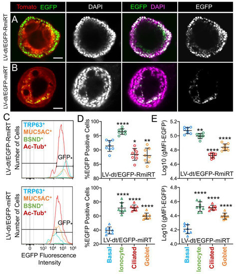 We next performed similar studies in airway organoid cultures generated from LV-dt/EGFP-miRT and LV-dt/EGFP-RmiRT transduced basal cells (Figure 5A). These airway organoids mature with time to form an external basal cell layer and internal luminal cell layer composed of differentiated columnar cells. Similar to ALI cultures, confocal imaging of intact organoids demonstrated that LV-dt/EGFP-RmiRT transduced organoids contained EGFP expressing cells that spanned the outer basal cell layer as well as the differentiated luminal cell layer. By contrast, Tomato-positive LV-dt/EGFP-miRT transduced cells of the organoid lacked EGFP expression in the outer basal cell layer, but EGFP-positive luminal cells were observed. Tomato expression was dimmer than in the outer layer of basal cells in both groups, similar to ALI cultures, suggesting that the PGK promoter may be less active in the basal cells.