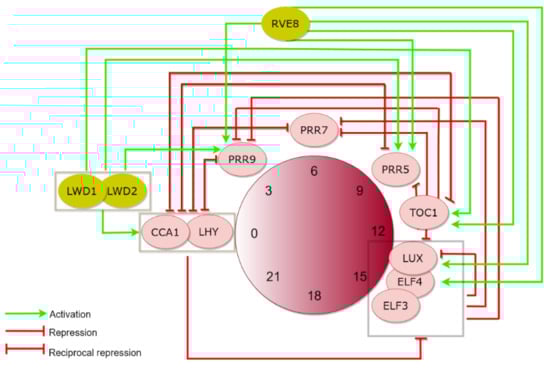 - Huang, W.; Pérez-García, P.; Pokhilko, A.; Millar, A.J.; Antoshechkin, I.; Riechmann, J.L.; Mas, P. Mapping the core of the Arabidopsis circadian clock defines the network structure of the oscillator. Science 2012, 335, 75–79. [Google Scholar] [CrossRef]