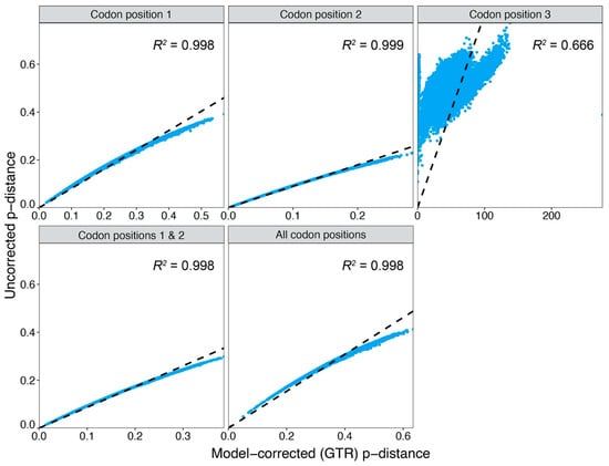 Substitution saturation plots showing the linear relationship between uncorrected and model-corrected (GTR) genetic distances for cytochrome oxidase subunit 1 (COI) codon position 1–3, codon positions 1 and 2 combine, and all codon positions combined. The linear regression (dotted line) and coefficient of determination (R2) are indicated for each plot.