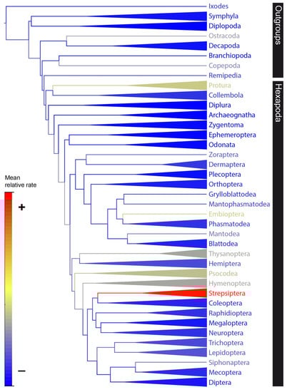 Bayesian COI gene tree using a topological constraint matching Misof et al.’s [61] phylogeny and a relaxed molecular clock set to 1 substitutions/site/time to estimate relative rates of nucleotide substitution across Hexapoda. Branch/label colors indicate mean relative rates for each clade (see scale). Clades with multiple taxa are collapsed into cones. See Figure S2 for phylogeny displaying all branches with support values for non-constrained nodes.
