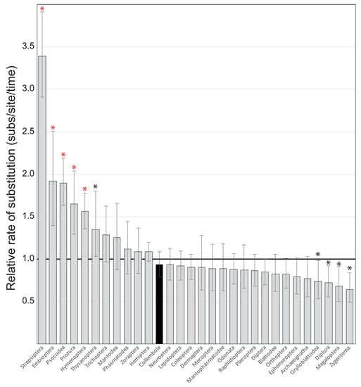 Bar chart of mean relative rates of nucleotide substitution in COI for all major Hexapod groups. Error bars represent the 95% highest posterior density (HPD) mean rate interval. Asterisks indicate rates that are significantly different from the mean rate of 1 (horizontal black line); red asterisks indicate rates that are significantly different from Collembola rates (black bar).
