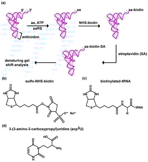 To successfully use this biotin-SA conjugation assay to monitor the aminoacylation of tRNA, however, two key points need to be considered. First, due to the diverse chemical structures of proteinogenic amino acids, whether the biotin-SA conjugation method is broadly applicable to these structures is unknown. Additionally, aminoacylation of tRNA takes place in two distinct mechanisms [29,32], where class I aminoacylation trans-esterifies the aminoacyl moiety to the 2′-hydroxyl of the terminal ribose in tRNA, while class II aminoacylation trans-esterifies to the 3′-hydroxyl [29,32]. While the generated aminoacyl group rapidly migrates between the two diols in both directions without enzyme catalysis, the 3′-aminoacyl group is stabilized by interaction with the translation elongation factor EF-Tu in complex with GTP in bacteria (eEF2 in eukaryotes) [29,33,34]. In the absence of EF-Tu-GTP, how the dynamics and equilibrium of the migration and whether one position is more favorable for biotin-SA conjugation are unknown. Second, for biotin-SA conjugation to specifically quantify the aminoacyl group in aa-tRNA, it cannot react with tRNA nucleotides. While tRNA nucleobases also contain primary amines (e.g., the 4-amine of adenosine, the 2-amine of guanosine, and the 4-amine of cytosine), these amines are associated with aromatic rings, rendering their electrons delocalized and much less nucleophilic toward the reactive NHS-ester. However, while tRNA nucleobases indeed do not react with NHS-ester [27], some natural post-transcriptional modifications to tRNA synthesized in cells contain a primary amine that is reactive with NHS-ester [35]. A notable example is the 3-(3-amino-3-carboxy propyl) (acp3) modification to uridine [36,37] (Figure 1d), which contains an alkyl-amine on the carboxy propyl side chain of the modified uridine that serves as a reactive site with Cy3- or Cy5-NHS for fluorescence labeling of tRNA [38]. Whether this acp3-modified uridine, which usually occurs in the highly compact tertiary core structure of tRNA at position 47 in the V-loop or position 20 in the D-loop [39], is as accessible to the biotin-SA conjugation as the alkyl-amine of the aa-tRNA is unknown. Below, we address both key points in our development of the biotin-SA conjugation assay, using E. coli tRNAs and E. coli aaRS enzymes as a model.