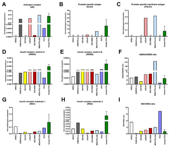 As a first step, we quantified the transcripts of the main hormone receptors. The expression levels of androgen receptor (AR) and its target genes, prostate-specific antigen (PSA, KLK3), and prostate-specific membrane antigen (PSMA, FOLH1) were most pronounced in LNCaP and MDA-PCa-2b cells (Figure 1A–C). The insulin receptor isoform A (INSRA)/insulin receptor isoform B (INSRB) ratio was highest in MDA-PCa-2b cells (Figure 1D–F), suggesting the activation of a mitogenic insulin pathway [17]. PC3 cells demonstrated the largest insulin receptor substrate (IRS) IRS1/IRS2 ratio (Figure 1G–I).