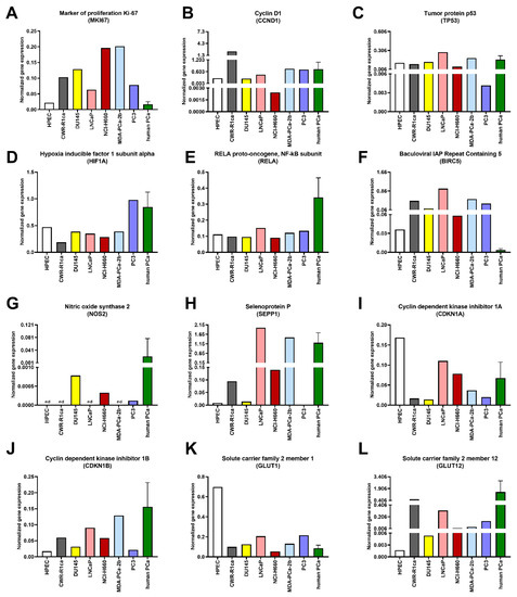 Next, we analyzed three genes that are involved in proliferative pathways [18,19]. The expression of Ki-67 (MKI67) was the highest in NCI-H660 and MDA-PCa-2b cells (Figure 3A). CWR-R1ca cells showed the strongest expression of cyclin D1 (CCND1) (Figure 3B). The mRNA level of tumor protein p53 (TP53) was high in LNCaP and MDA-PCa-2b cells (Figure 3C). Hypoxia inducible factor 1 subunit α (HIF1A) and RELA proto-oncogene NF-kB subunit (RELA), as well as the NF-kB target genes, including baculoviral IAP repeat containing 5 (BIRC5), nitric oxide synthase 2 (NOS2), and selenoprotein P (SEPP1), are important regulators of carcinogenic processes in the development of PCa [20,21,22,23]. HIF1A was strongly expressed in PC3 cells (Figure 3D). mRNA levels of RELA and BIRC5 were comparable among the cell lines (Figure 3E,F). NOS2 was detected in three cell lines (Figure 3G). The transcript levels of SEPP1 were the largest in LNCaP and MDA-PCa-2b cells (Figure 3H). Cyclin-dependent kinases and their inhibitors are implicated in mitogenic signaling and were demonstrated to be regulated by androgen signaling [18]. Cyclin-dependent kinase inhibitor 1A (CDKN1A) showed strong gene expression in HPEC cells (Figure 3I). The mRNA levels of CDKN1B were the highest in LNCaP and MDA-PCa-2b cells (Figure 3J). Glucose transporters regulate crucial tumorigenic pathways, which have particular interest in the term of diabetes [24]. Among the analyzed glucose transporters, solute carrier family 2 member 1 (GLUT1) showed the strongest expression in HPEC cells (Figure 3K). The strongest gene expression for solute carrier family 2 member 12 (GLUT12) was found in CWR-R1ca cells (Figure 3L).