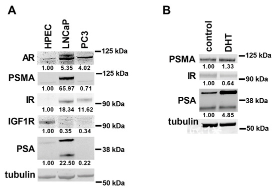 Protein levels of androgen receptor (AR), PSA, prostate-specific membrane antigen (PSMA), insulin receptor (IR), and insulin-like growth factor 1 receptor (IGF1R) in prostate-cancer cell lines. Proteins detected using SDS-PAGE and Western blot. (A) For HPEC, LNCaP, and PC3 cell lysates, AR, PSA, PSMA, IR, and IGF1R antibodies were applied. (B) For LNCaP cell lysates, PSA, PSMA, and IR antibodies were applied. As loading control, β-tubulin was used. Protein intensities were normalized to (A) β-tubulin and HPEC cells or (B) control condition. These relative protein intensities are under the pictures. For quantifying PSA intensity, upper protein bands were evaluated. Control: LNCaP cells grown in growth medium; DHT: dihydrotestosterone treatment of LNCaP cells after serum deprivation. Numbers on the right side represent molecular-weight markers.