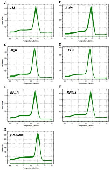 Melting curves of the seven candidate reference genes in Tamarixia radiata. (A) 18S, (B) Actin, (C) ArgK, (D) EF1A, (E) RPL13, (F) RPS18, and (G) β-tubulin.