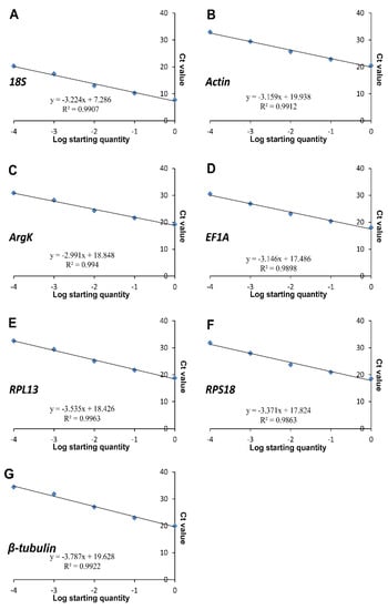Standard curves of the seven candidate reference genes. (A) 18S, (B) Actin, (C) ArgK, (D) EF1A, (E) RPL13, (F) RPS18, and (G) β-tubulin.