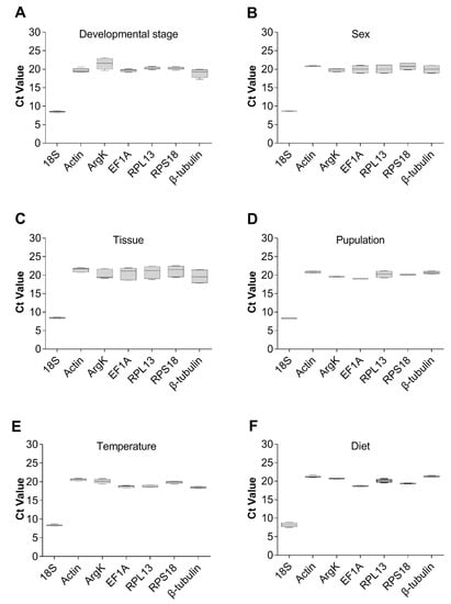 Expression profiles of the seven candidate reference genes in all six experiments for T. radiata. The expression levels of the reference genes are shown in terms of the Ct-value for each experimental condition. (A) Developmental stage, (B) sex, (C) tissue, (D) population, (E) temperature, and (F) diet.