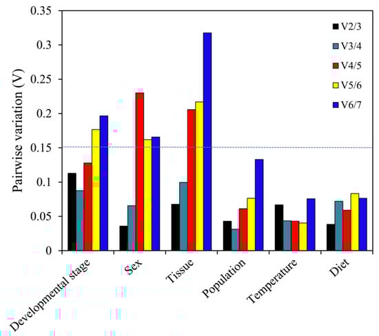Pairwise variation (V) values using geNorm based on different comparisons: developmental stage, sex, tissue, population, temperature and diet.