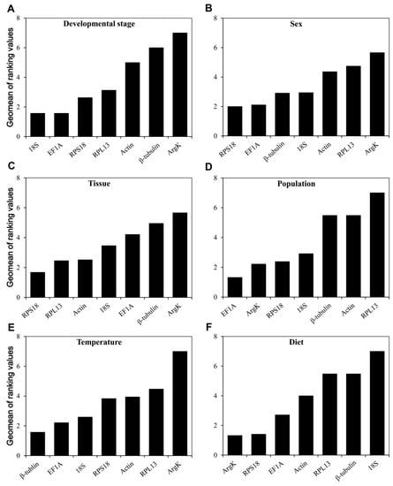 Stability of the seven candidate reference gene expressions in T. radiata under different treatment conditions analyzed using RefFinder. A lower Geomean value indicates a more stable expression based on RefFinder. (A) Developmental stage, (B) sex, (C) tissue, (D) population, (E) temperature, and (F) diet.