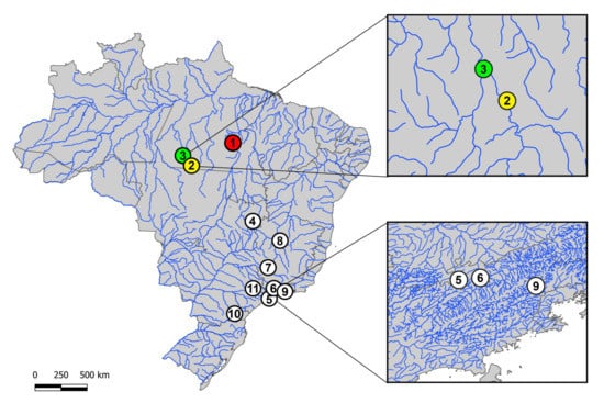 Brazilian collection sites of the three Harttia species cytogenetically investigated in the present study (colored circles) and the ones previously cytogenetically analyzed (white circles: data from [9,13]). 1. H. duriventris (red circle); 2. H. villasboas (yellow circle); 3. H. rondoni (3-green circle); 4. H. punctata; 5. H. gracilis; 6. H. carvalhoi; 7. H. torrenticola; 8. H. longipinna; 9. H. loricariformis; 10. H. kronei; 11. H. absaberi. The boxes highlight the non-sympatric distribution of some species.