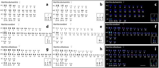Karyotypes of H. duriventris (a–c) H. villasboas (d–f) and H. rondoni (g–i) arranged by sequentially Giemsa-stained (a, d and g) and C-banded chromosomes (b, e and h) and hybridized with 5S rDNA (red) and 18S rDNA (green) probes after a double-FISH analysis (c, f, and i). Boxes depict the male sex chromosomes. Bar = 5 μm.