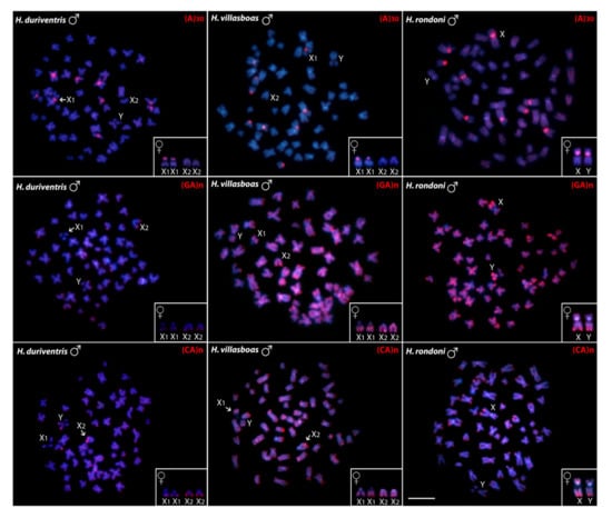 Metaphase chromosomes of males H. duriventris, H. villasboas and H. rondoni hybridized with microsatellite-containing oligonucleotides. Chromosomes were counterstained with DAPI (blue) and microsatellite probes were directly labeled with Cy3 during synthesis (red signals). The female sex chromosomes are shown in boxes. Bar = 5 µm.