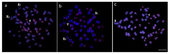 - Blanco, D.R.; Vicari, M.R.; Lui, R.L.; Artoni, R.F.; de Almeida, M.C.; Traldi, J.B.; Margarido, V.P.; Moreira-Filho, O. Origin of the X1X1X2X2/X1X2Y sex chromosome system of Harttia punctata (Siluriformes, Loricariidae) inferred from chromosome painting and FISH with ribosomal DNA markers. Genetica 2014, 142, 119–126. [Google Scholar] [CrossRef]