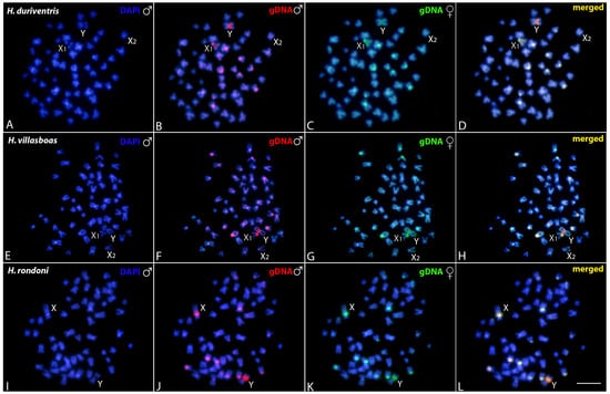 Mitotic chromosome spreads of males H. duriventris (A–D), H. villasboas (E–H) and H. rondoni (I–L) after intraspecific CGH procedures. Male- and female-derived genomic probes were hybridized together for each species. First column (A, E and I): DAPI images (blue); Second column (B, F, and J): hybridization pattern of the male-derived probe (red); Third column (C, G, and K): hybridization pattern of the female-derived probe (green). The fourth column (D, H, and L): merged images of both genomic probes and DAPI staining. The common genomic regions for males and females are depicted in yellow. Sex chromosomes are indicated. Bar = 10 μm.