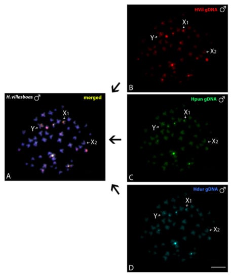 When the gDNA of H. duriventris, H. villasboas and H. punctata (all X1X2Y-species) was compared, no species-specific region in the sex-chromosomes were observed, thus pointing to their common genomic content (Figure 6).