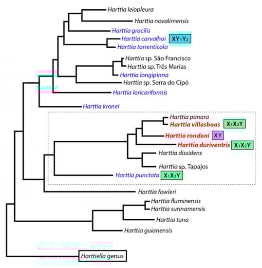 Adapted phylogenetic tree for the genus Harttia, based on the molecular-phylogenetic data generated by Covain [19]. Previous and now cytogenetic analyzed species are indicated in blue and red, respectively. The multiple X1X2Y (green boxes) and XY1Y2 (blue box) sex chromosome found in Harttia is also indicated, together with the putative proto or neo XY system (purple box). Species from northern Brazilian region are highlighted with the dotted line.