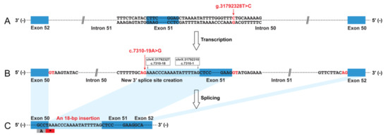 Graphic representation of the non-canonical splicing event caused by a de novo and novel genomic intronic variant in the dystrophin (DMD) gene. The intronic variant c.7310-19A>G in intron 50 created a new 3′ splice site that was stronger than the natural acceptor site of exon 51. This caused the inclusion of an 18 bp sequences into the mature transcript, which was predicted to create a premature termination codon. (A) Patient genome (NC_000023.10); (B) dystrophin pre-mRNA; (C) dystrophin mRNA (NM_004006.2).
