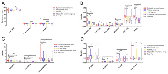 Different groups of dystrophin PEs had a smaller density of total ESEs (splice site group, SRE group, and possible poison exon group) compared to the group of dystrophin CEs (Table S3; Figure 3C). The possible poison exon group had a smaller density of RESCUE-ESE, Tra2, 9G8, EIE, or NI-ESE compared to the CEs group (Figure 3B). In addition, the possible poison exon group also had a smaller density of ASFB compared to the SRE group. The ESE density of RESCUE-ESE, 9G8, EIE, or NI-ESE of the SRE group was, respectively, smaller than that of the CEs group. The NI-ESE density of the splice group was smaller than that of the CEs group.