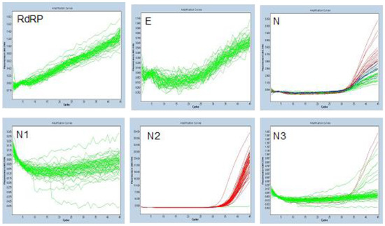 When applied to pools of positive samples used in our laboratory as internal quality controls for RT-qPCR assays for other respiratory viruses (influenza A, H1N1, and H3N2, parainfluenza virus 3 and 4, rhinovirus, coronavirus 229, and coronavirus HKU) N1, RdRP, RdRP (modified), E, and E (modified) assays did not return false-positive results. The in-silico cross-reactivity analysis of all primers used in this study was described elsewhere [4,15,16].