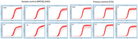 The nasopharyngeal swabs samples from the 60 healthy volunteers were submitted to the six considered SARS-CoV-2 assays to check the generation of unspecific response. We observed consistent false-positive results for N and N2 (60 out of 60 samples for both). The N3 assay generated a false-positive signal or inconclusive results in 13 out of 60 tested samples. Because of this the N2, N3, and N assays were not considered for subsequent experiments due to the lack of analytical specificity under our conditions (Figure 1). This lack of analytical specificity was not observed for N1, E, and RdRP. In addition, E and RdRP assay primer/probe concentrations were modified (termed E (modified) and RdRP (modified)), and this concentration optimization did not interfere with the specificity of the assays (20 healthy volunteers’ samples tested—results not presented).