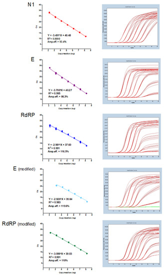 Assays′ amplification efficiency analysis. Left panel—linear regression analysis; right panel—raw data. The better amplification efficiency was observed for N1 (close to 100%), followed by RdRP (modified), E, RdRP, and E (modified).