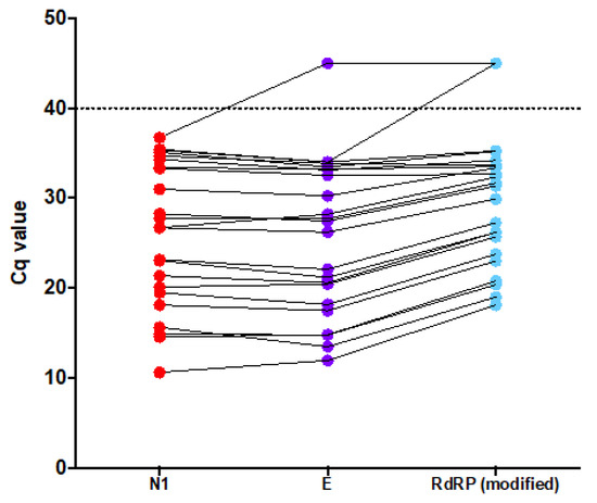 The first version of the proposed method was based on N1, E, and RdRP (modified) because these assays showed better amplification efficiencies and consequently better limits of detection in the experiments using contrived samples. The test started to be applied to the population of Brazil’s Federal District on 19 February 2020 and the first positive sample was detected on 4 March 2020 (Brazil’s Federal district’s case zero). After processing 968 samples (23 tested positive and 945 tested negative), it was noted that median (min–max) Cq values for N1 were 26.71 (10.61–36.72), for E were 27.44 (11.93–> 40), and for RdRP were 31.35 (10.61–> 40) (Cq > 40 meaning not detected) (Figure 5). Twenty-one samples returned positive and 942 results were negative for the three assays resulting in 91.3% positive agreement and 99.6% negative agreement. One sample was positive for N1 and E, but not for RdRP (modified). Another sample was positive only for N1. These resulted in 95.6% positive agreement and 99.7% negative agreement for N1 versus E. Hence, the RdRP assay was removed from the proposed method, which thereafter was based on N1 and E.