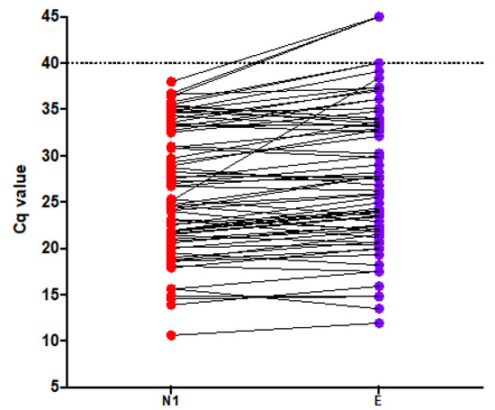 Cq values observed for the first 75 positive samples detected by the second version of the proposed method: N1 (red) and E (magenta). Dashed line depicts the cut-off value of >40. Three samples were positive only for N1 suggesting a better diagnostic capability for this assay.