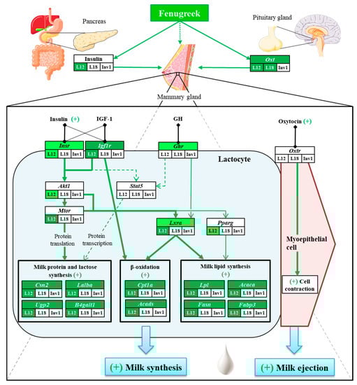 Fenugreek Stimulates the Expression of Genes Involved in Milk Synthesis and Milk Flow through Modulation of Insulin/GH/IGF-1 Axis and Oxytocin Secretion