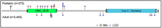 Locations of SOX17 likely gene disrupting (LGD) and rare predicted deleterious missense (D-Mis) variants carried by PAH cases from five cohorts from the US, UK and Japan. Variants carried by pediatric cases (n = 19) are shown above the protein schematic and variants carried by adult cases (n = 13) below the schematic. The combined datasets include 273 pediatric and 3455 adult cases [11,13,22,41,42].