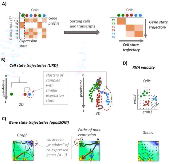Hence, pt trajectories refer to ordered series of cell states. Alterations of activities of selected genes or gene sets along these trajectories then provide pt profiles of gene expression, which represent x-y plots depicting the expression levels as a function of pt [18]. They characterize (pseudo-)temporal changes of cellular programs upon development and can proceed, e.g., in a switch-like or in a more continuous fashion, or they can upregulate in intermediate, transient states [19]. Accordingly, molecular developmental characteristics can be split into two orthogonal views, namely focusing either onto the cells as the functional unit or onto molecular programs as changes of function independent of the associated cell state(s). Both aspects are closely related but not identical because development into different cell types can be driven by the same or by different molecular processes and, vice versa, different programs can associate with one or multiple cell types. For example, co-evolution of tumor cells and their microenvironment involves different cell types and states, which are expected to show co-regulation in gene-state space and potentially could support inference of the development of molecular communication networks between different cell types (see [20,21] and references cited therein). Trajectories in cell-state space are addressed by the numerous pt-approaches mentioned above while elaborated methods and applications for visualization and analytics of developmental paths in gene state do not exist to the best of our knowledge.