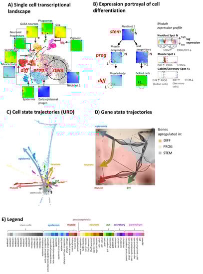 The following are available online at https://www.mdpi.com/2073-4425/11/10/1214/s1. Figure S1: Cellular markers and previous signatures of planarian single cell transcriptome, Figure S2: Positions of selected genes are shown in the map together with their expression profiles, Figure S3: Profiles and maps of tissue-wise differentially expressed genes and gene sets which were identified by [29], Table S1: References of selected marker genes of Figure S1, Table S2: Overview of module-wise enriched gene sets of the GO terms Biological Process, Cellular Component, Molecular function and Protein Domains.